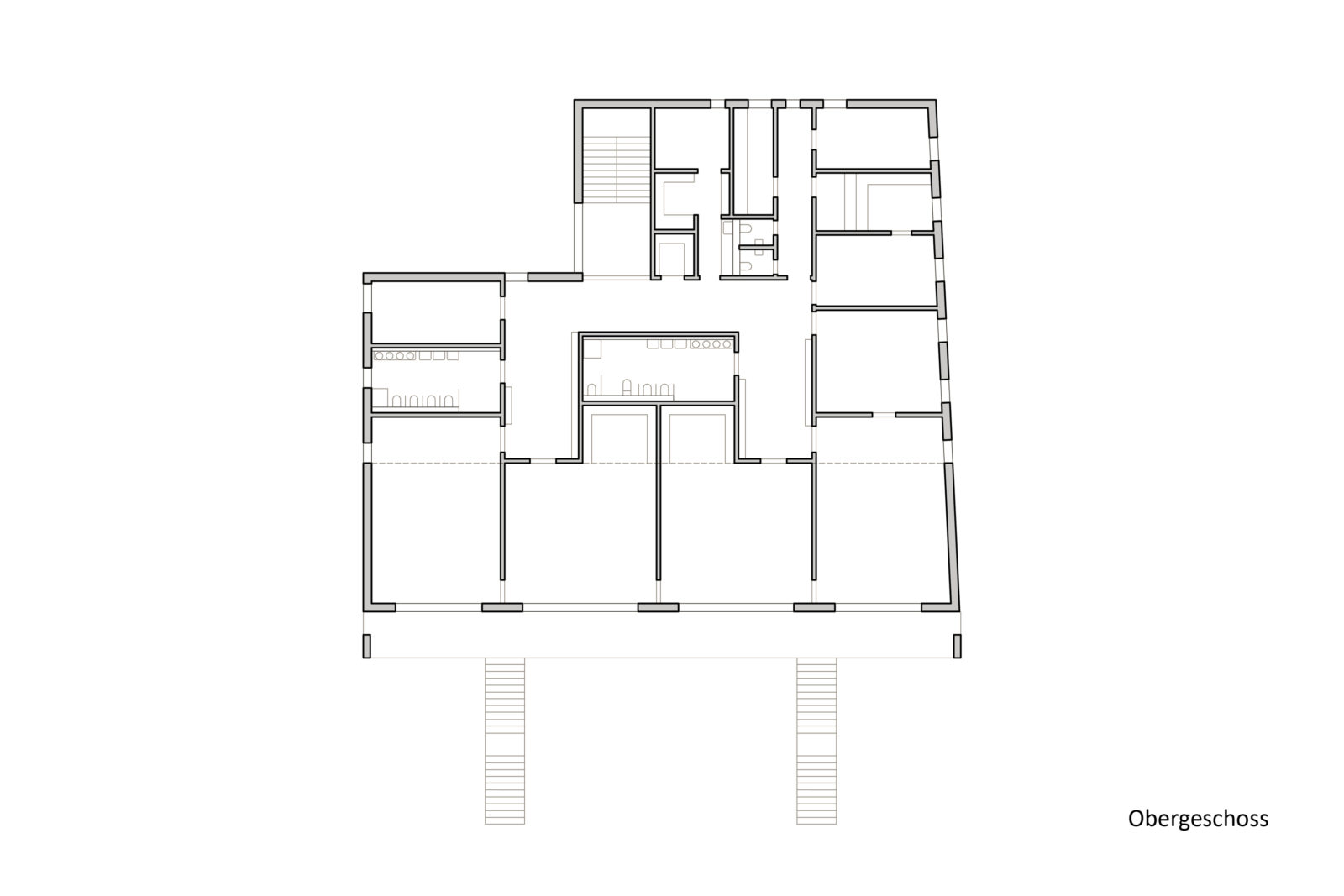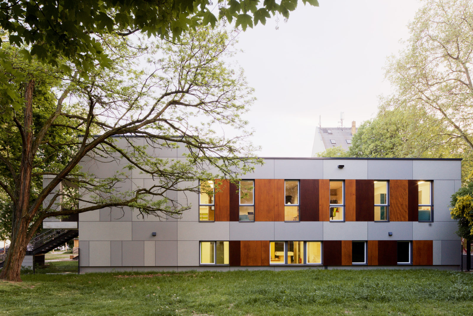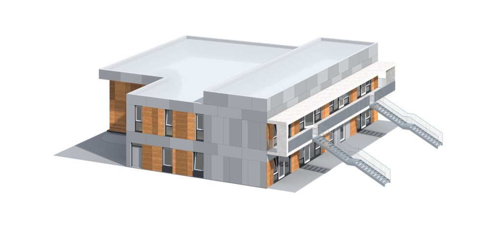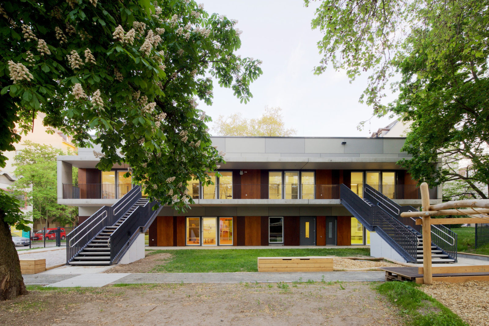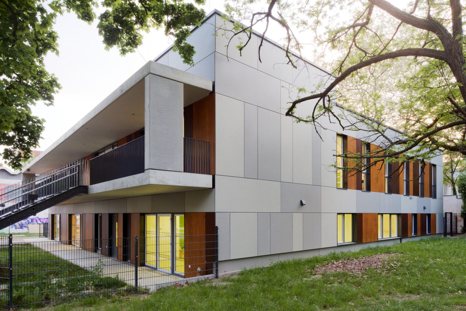 An den Garten sind die Gruppenbereiche über einen vorgelagerten Balkon mit Außentreppen angebunden. Diese haben in Ihrer Funktion als Flucht- und Rettungswege entscheidende Bedeutung für ein wirtschaftliches und funktionales Grundrisskonzept mit optimierten Flucht- und Rettungswegen.