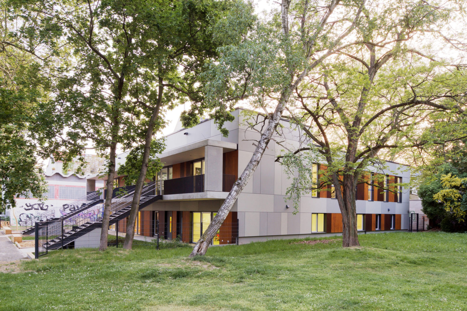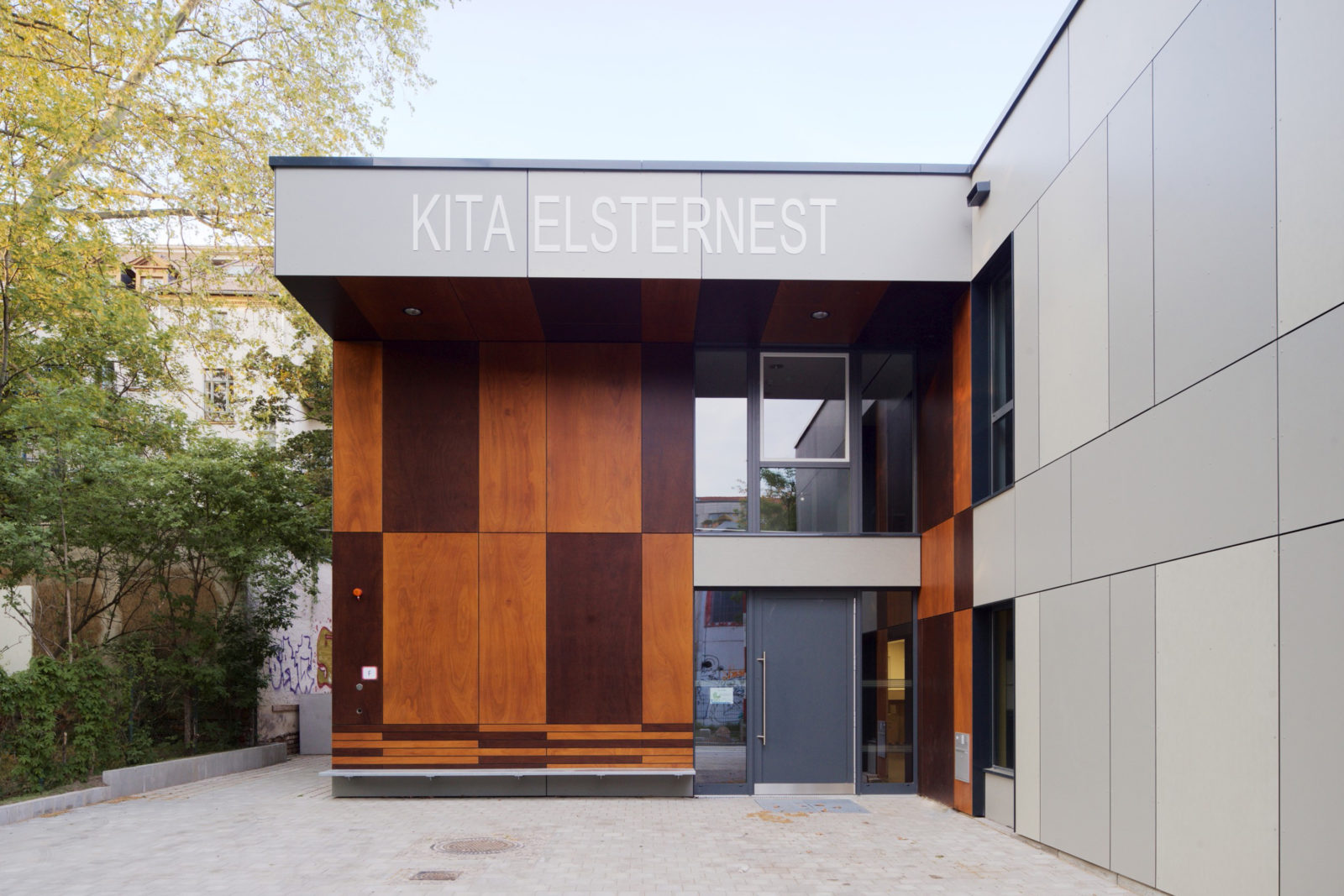 Die Leipziger Wohnungs- und Baugesellschaft LWB errichtete den Neubau einer Kindertagesstätte für 30 Krippenkinder und 72 Kindergartenkinder als integrative Einrichtung am Standort Elsterstraße 2 auf einem vorhandenen, bislang als Teil einer Grünfläche genutzten Grundstück.