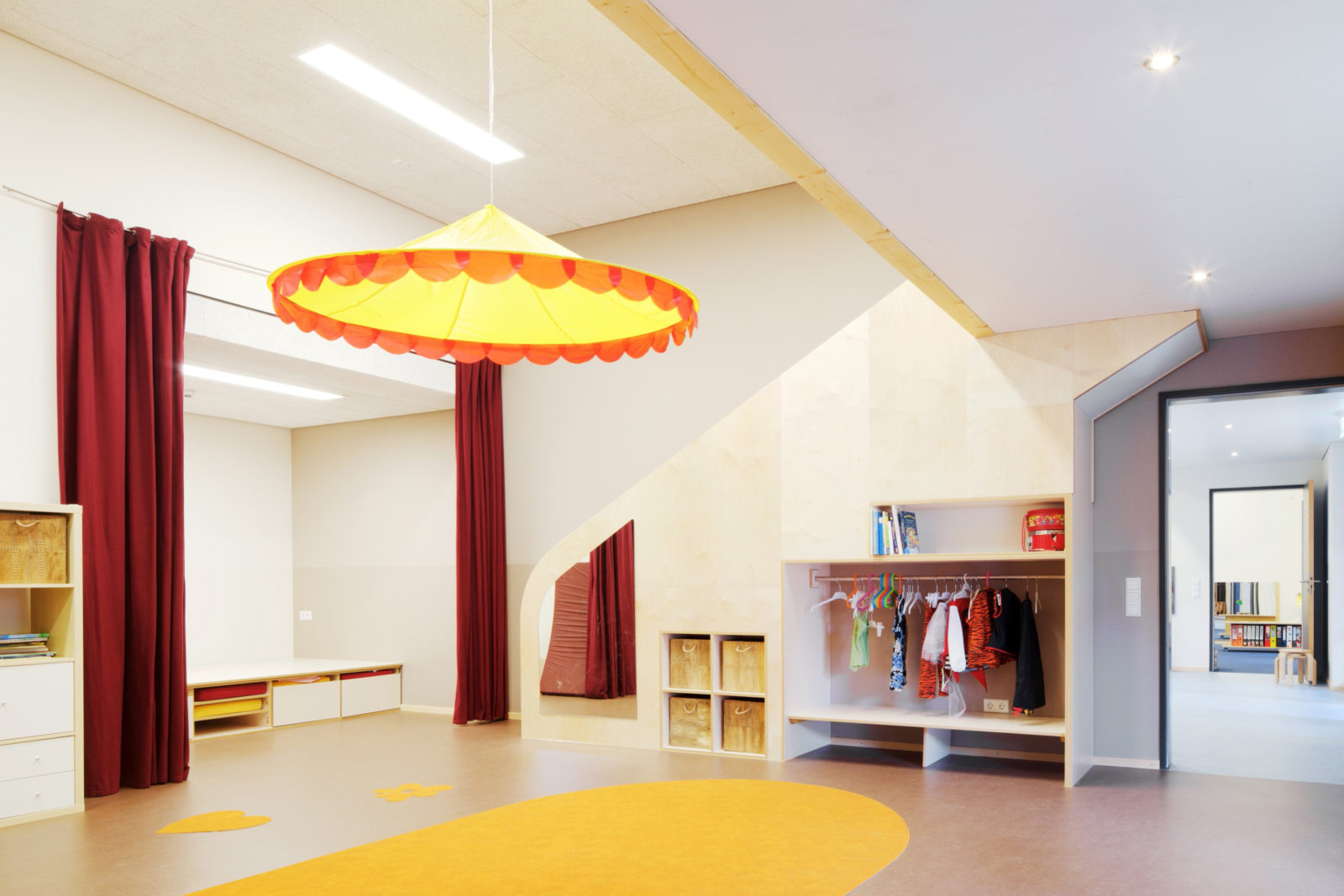 Die Gruppenräume des Kindergartens verfügen über jeweils teilweise zusätzliche Raumhöhen und ermöglichen den Einbau einer 2. Ebene im Sinne einer Spielempore.