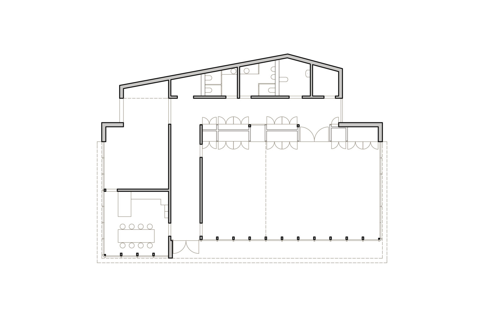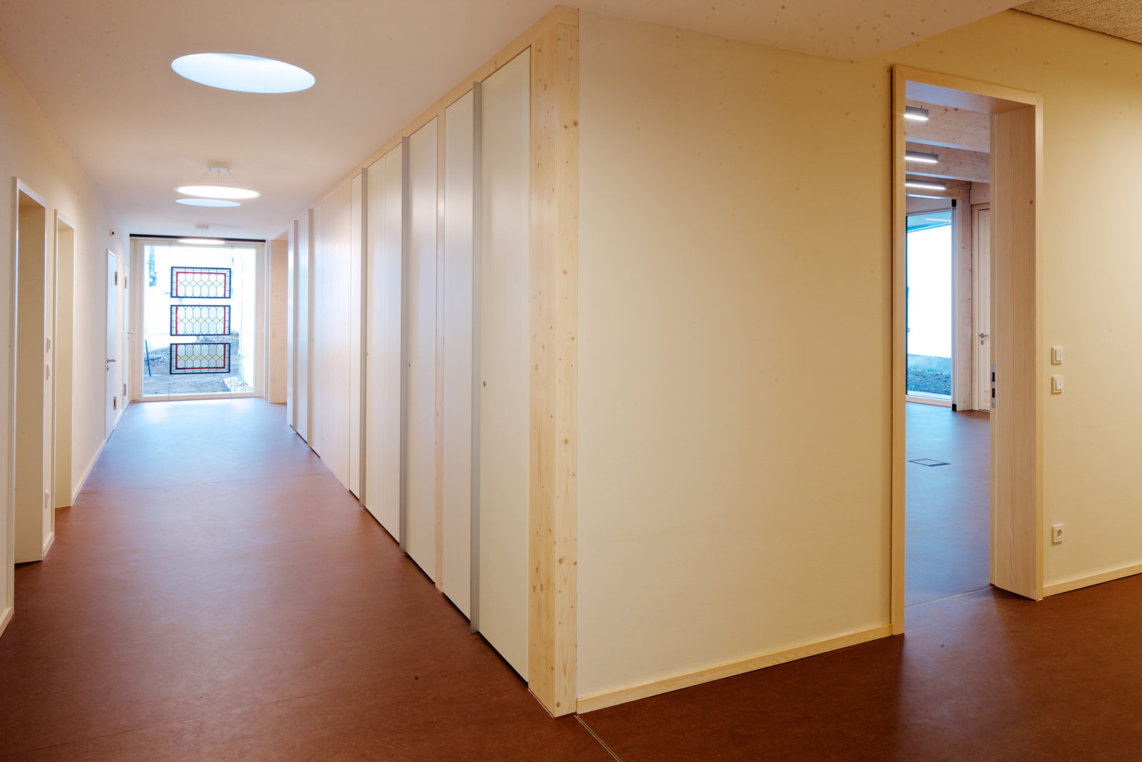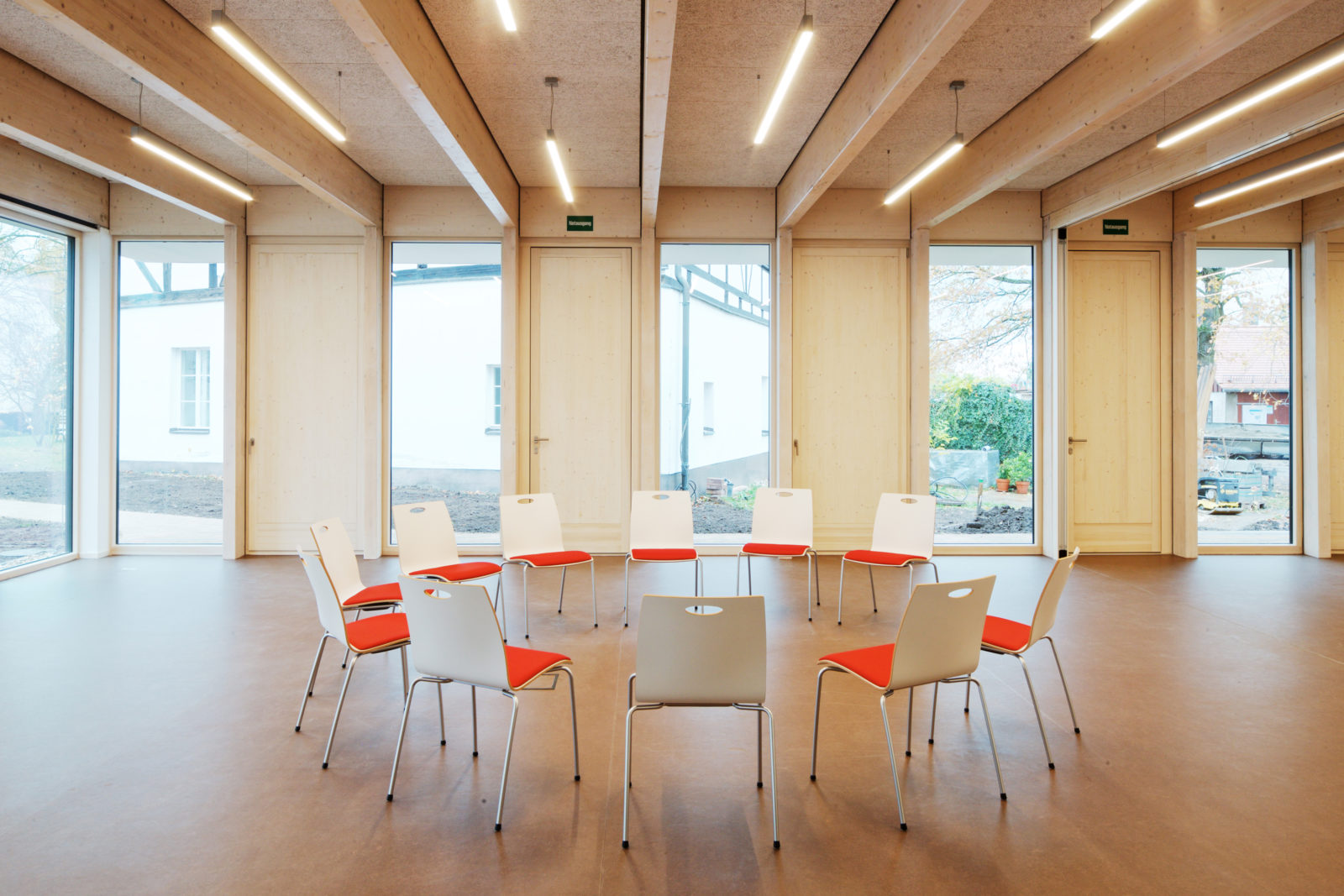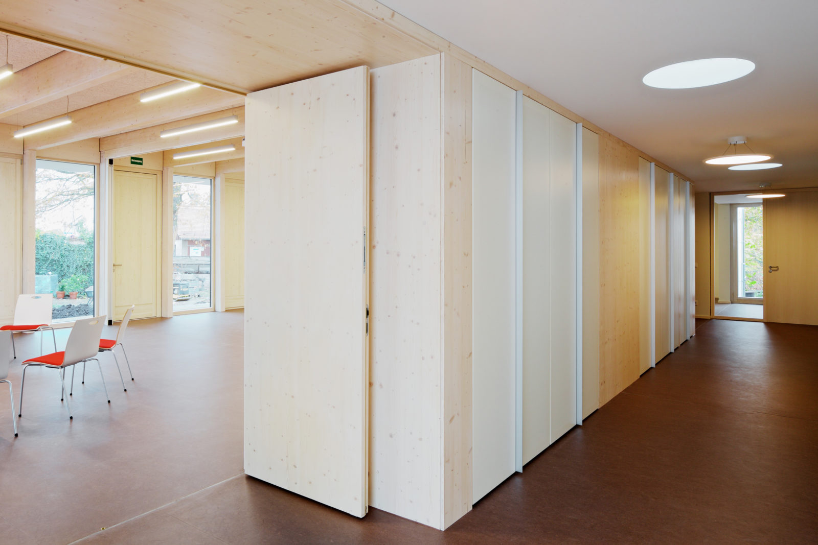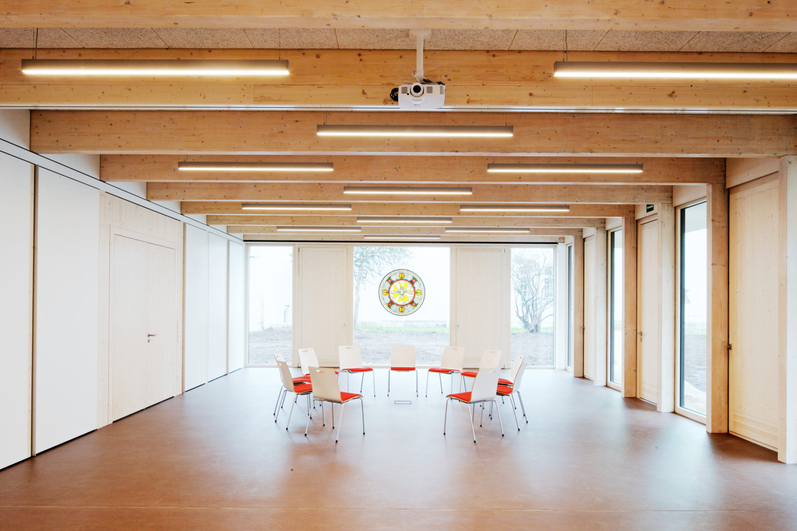 Das Gebäude ist eingeschossig ohne Unterkellerung geplant. Eine interne Erschließungsachse befindet sich in dem grenzständigen, niedrigen Baukörper und wird von dienenden Funktionen wie Küche, WC-Bereiche, Technik und Garderoben flankiert. Der gartenseitige, überhöhte Baukörper beinhaltet den Gemeindesaal. Dieser kann mit mobilen Trennwände in die gewünschte Kleinteiligkeit mit Jugendraum, Foyer und zwei Sälen unterteilt werden. Der Jugendraum wird dabei direkt vom Foyer aus über ein Türelement innerhalb der mobilen Trennwand erschlossen, während der teilbare Saal vom Gang aus erschlossen wird. Befinden sich sämtliche mobile Trennwandelemente in den Parktaschen, werden alle Gruppenräume zu einem Saal im Sinne einer höchstmöglichen Flexibilität zusammengefasst. Bei diesem Nutzungsszenario kann der Hauptzugang über die Stirnseiten erfolgen.